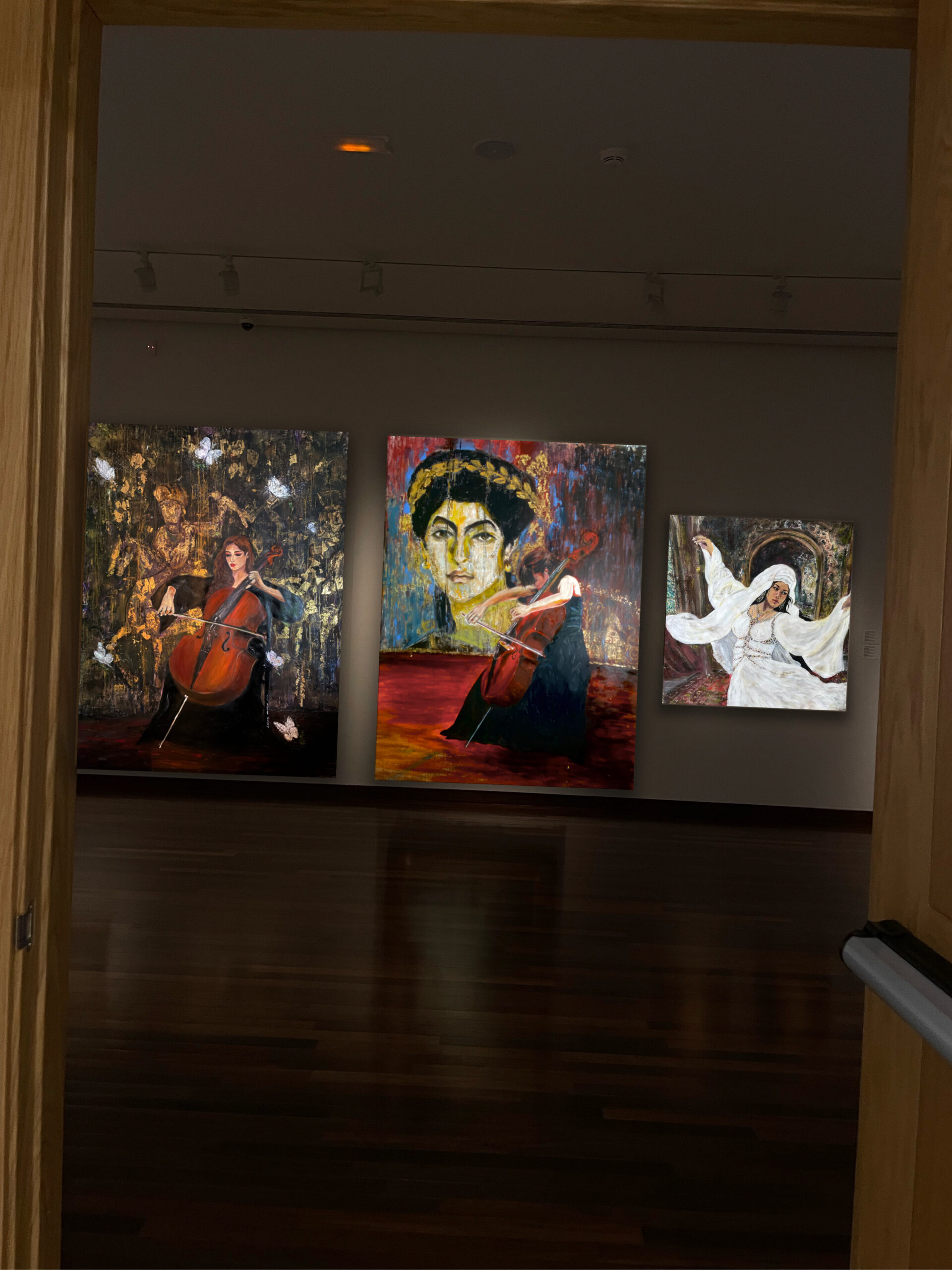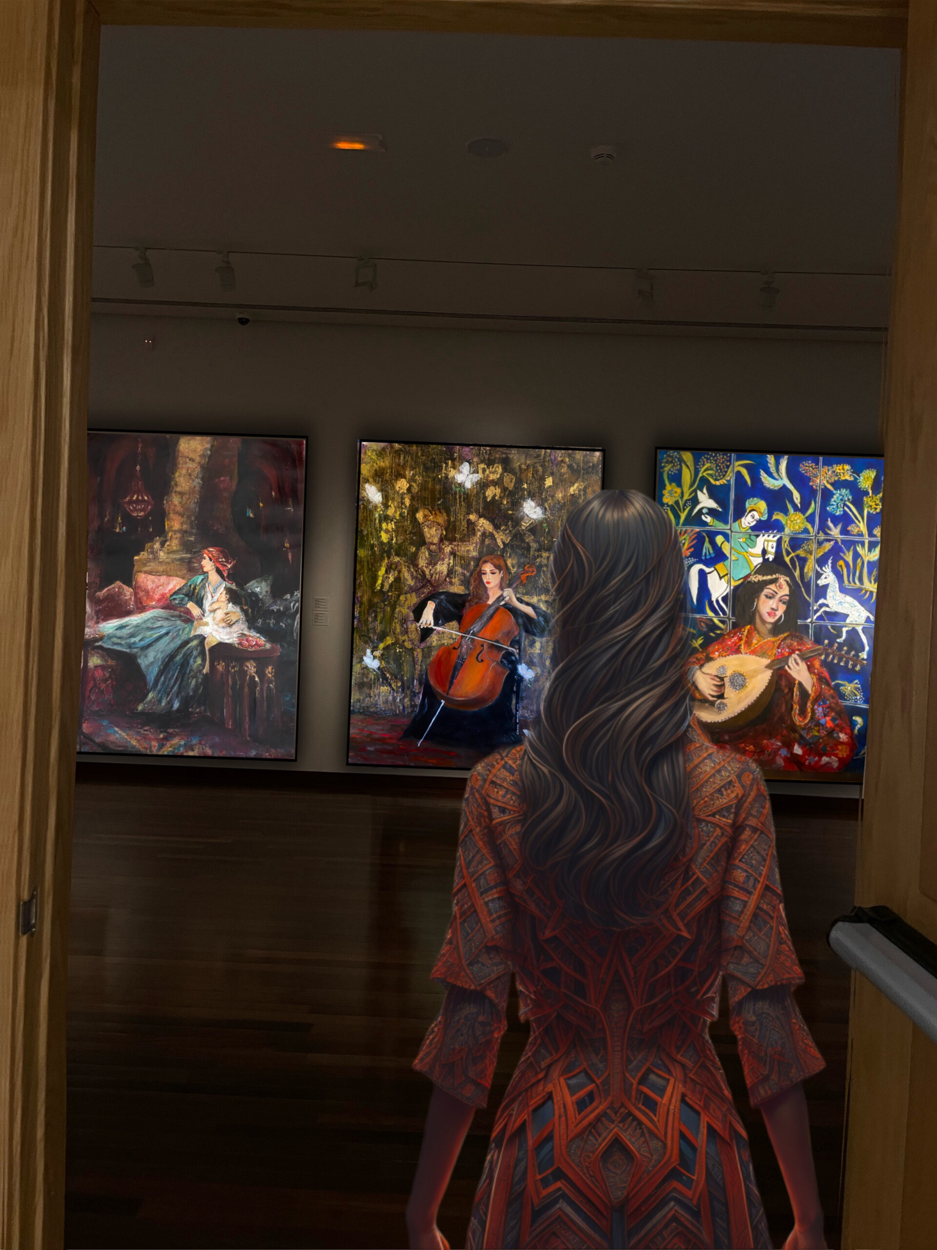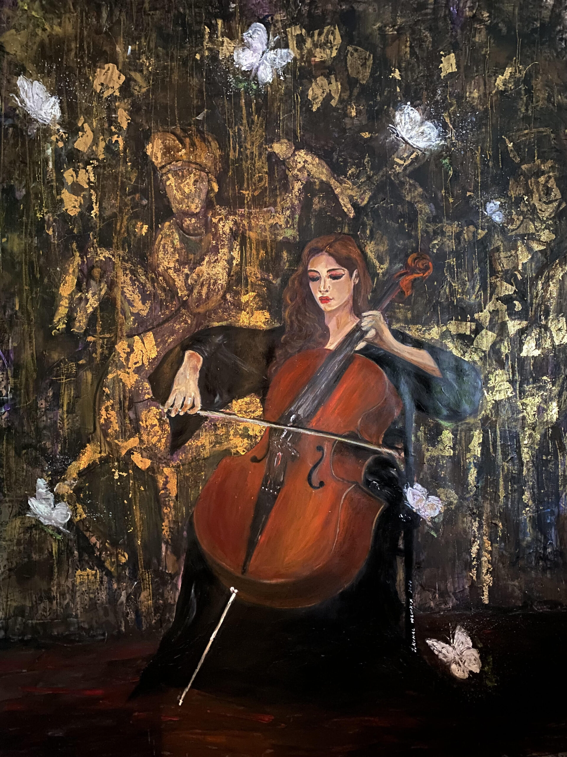 À travers différentes collections d’œuvres originales, la créatrice explore des territoires visuels distincts qui composent son identité artistique plurielle : la femme et le violoncelle, le Moyen-Orient et son héritage culturel, l’univers aquatique et la puissance des océans, la pratique du golf comme expression du mouvement, ainsi que l’art digital, la photographie artistique et les esquisses.